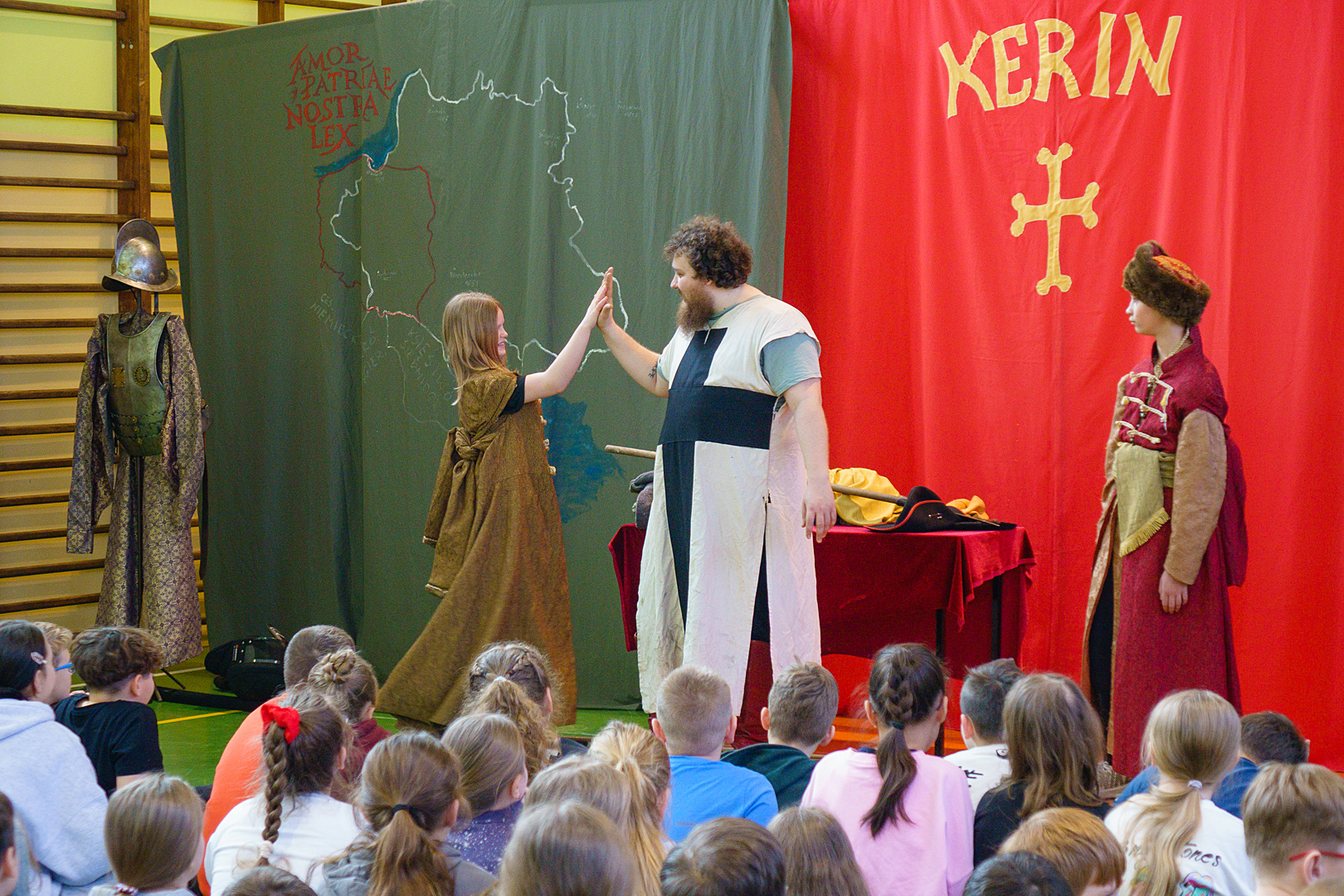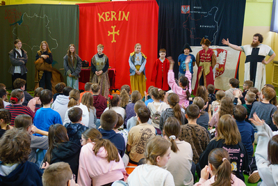 21 maja w naszej Szkole po raz kolejny odbyła się Żywa Lekcja Historii. Temat „Tysiąclecie Królestwa Polskiego” idealnie wpisywał się w tegoroczne obchody 1000 – lecia koronacji Bolesława Chrobrego. Prowadzący w barwny i humorystyczny sposób przekazał nam wiele ciekawych informacji dotyczących początków Państwa Polskiego, początków chrześcijaństwa, panowania Mieszka I i pierwszego króla Polski – Bolesława Chrobrego. W roli aktorów wystąpili uczniowie i nauczyciele, którzy chętnie zakładali przygotowane dla nich kostiumy i rekwizyty. Ciekawa i humorystyczna opowieść, a także wykorzystanie prawdziwych eksponatów i strojów z epoki pozostawiły w uczniach przekonanie, że historia nie przeminęła, ale jest fascynującą przygodą, w której mogą wziąć udział.