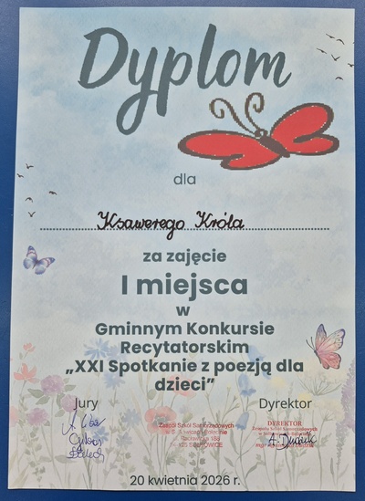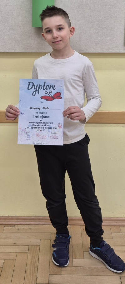 Wczoraj w Sułkowicach-Bolęcinie odbył się Gminny Konkurs Recytatorski "XXI Spotkanie z poezją dla dzieci". Uczeń naszej Szkoły- Ksawery Król z kl.3a zajął w nim I miejsce.